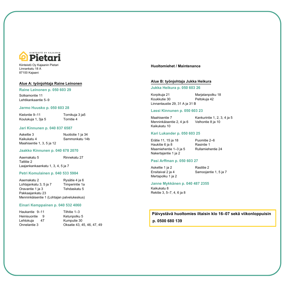Ajankohtaista Muutoksia yhteystiedoissa – huolto Hei! Muutoksia huoltomiesten yhteystiedoissa – nappaa päivitetty versio tästä!