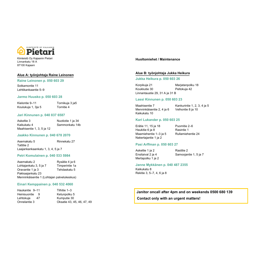 Muutoksia yhteystiedoissa – huolto