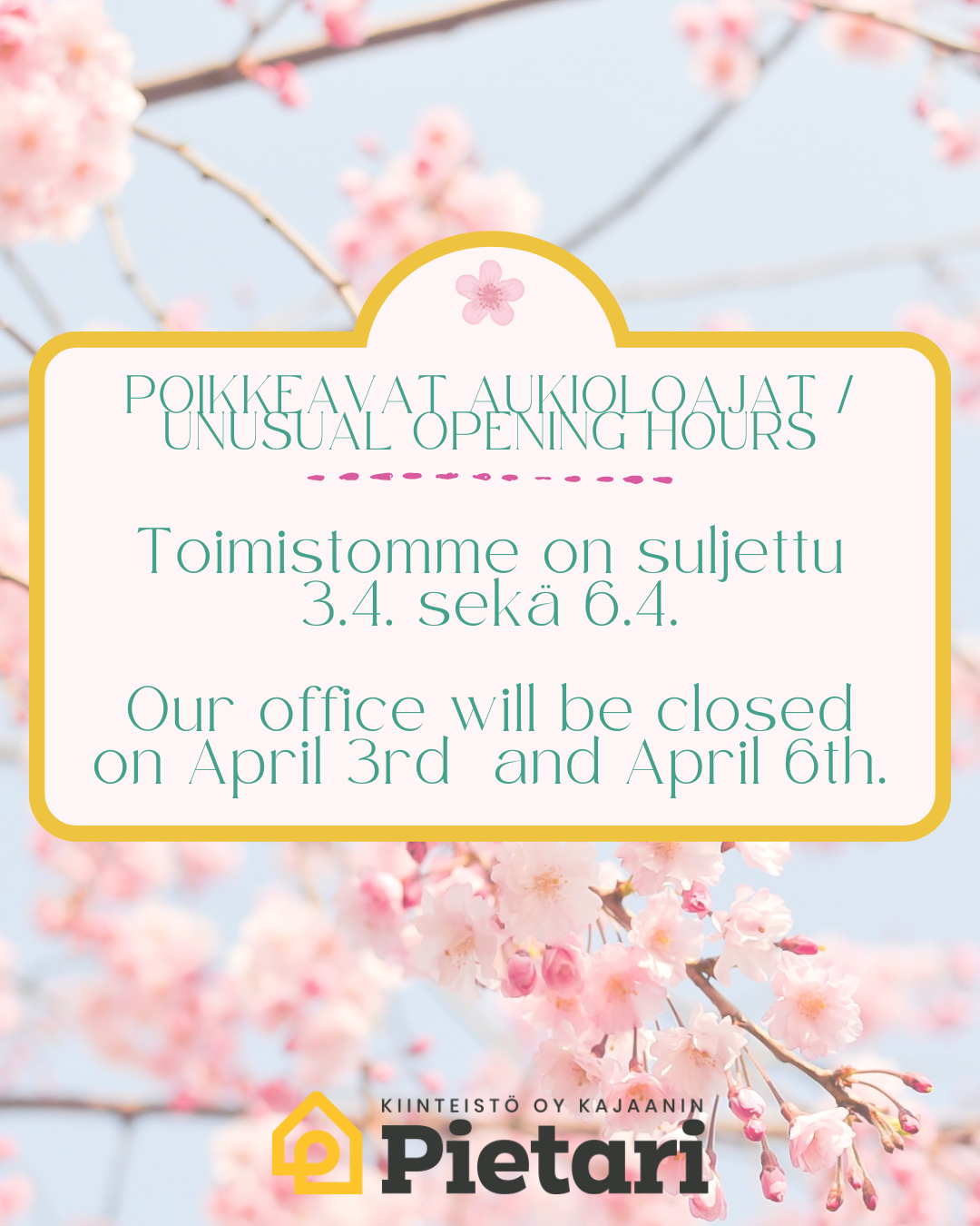 Ajankohtaista Pääsiäinen tuo mukanaan poikkeuksia aukioloaikoihin Huomaattehan pääsiäisen tuomat muutokset aukioloajoissa.